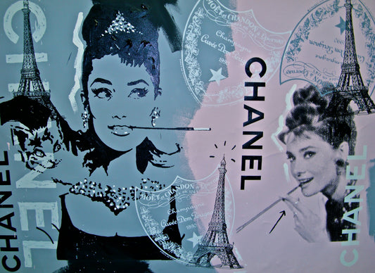 Stango Gallery: An American Icon: Audrey Hepburn | Pink and Grey Audrey Hepburn and Chanel,Dom Perignon, Eiffel Tower | Gallery at Studio Burke, Washington, DC