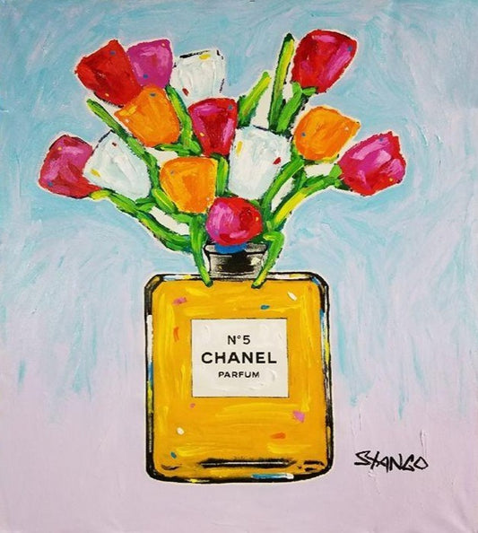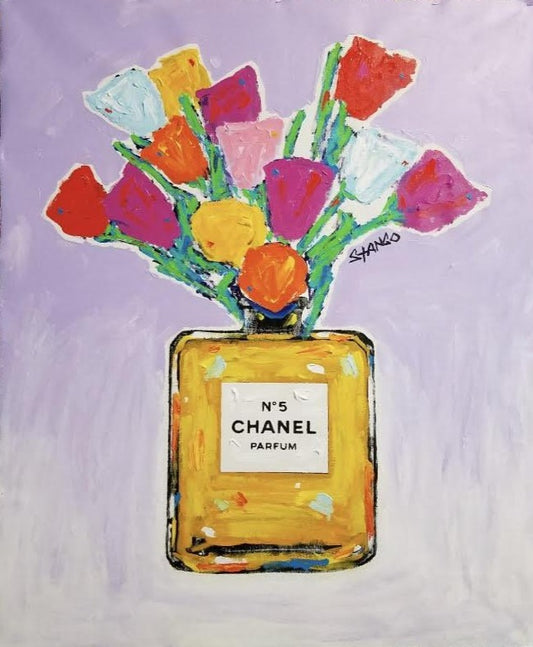 Stango Gallery: Chanel | Pale Lavender Chanel No.5 Parfum and Tulips | Chanel Bottle Pop Art | Gallery at Studio Burke, Washington, DC