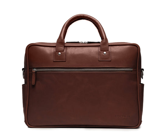 Redford Leather Brief Bag | 16" Zipper Briefcase | Initials Available | Korchmar Leather | Brown Leather with Nickle Zippers