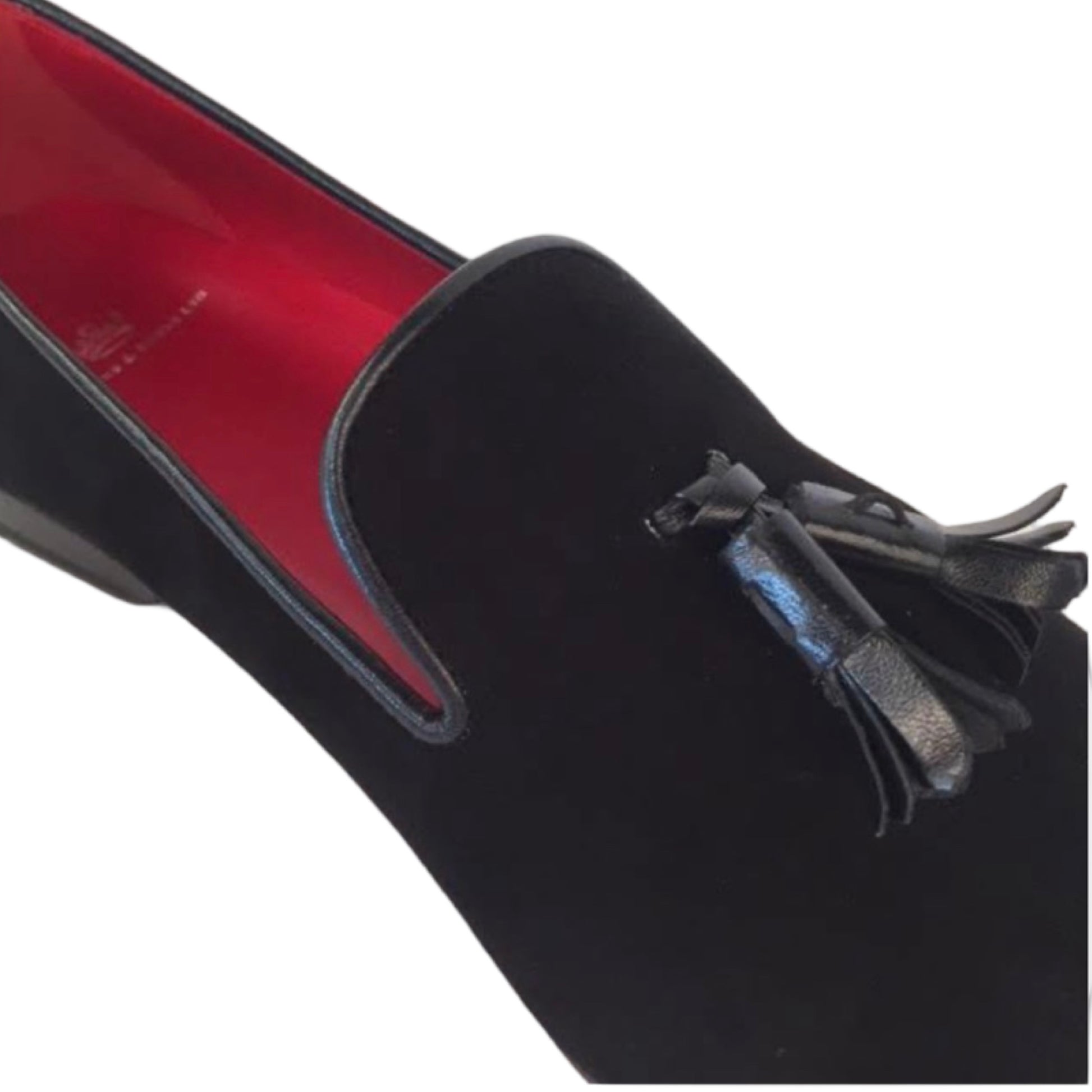 Black Velvet | Black Calf Leather Trim | Black Calf Leather Tassels | Sole and Interior Colour of your choice | Shown in Red