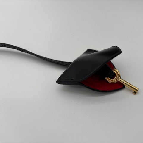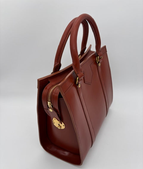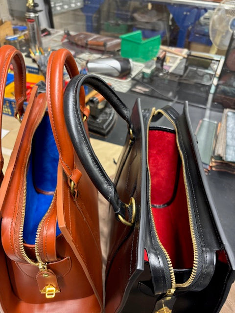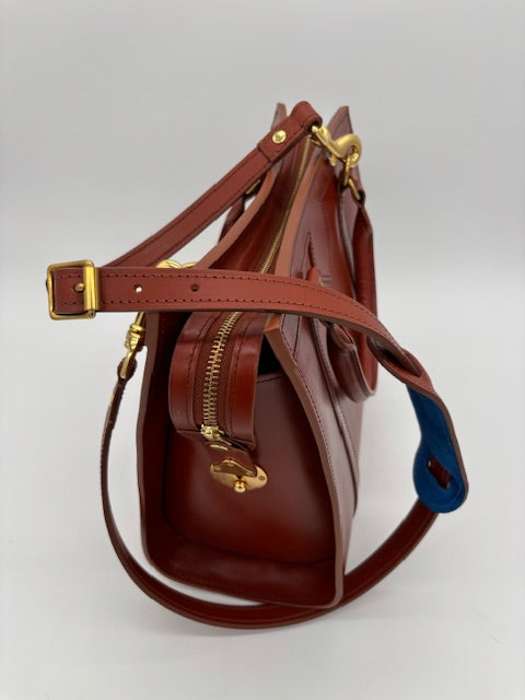 Bench-crafted black bridle leather handbag with brilliant red suede interior (cobalt blue shown here, red is in stock) and solid brass hardware with functional lock. An incredibly versatile design with top handles and a removable, adjustable shoulder strap. The rings are concealed by the handles when not in use. Interior zippered pocket on the back and an open pocket on the front. Carries everything you need in a day but keeps its shape when you only need the essentials for an evening out.