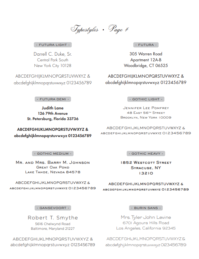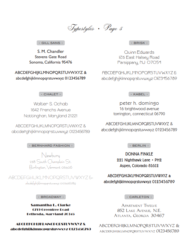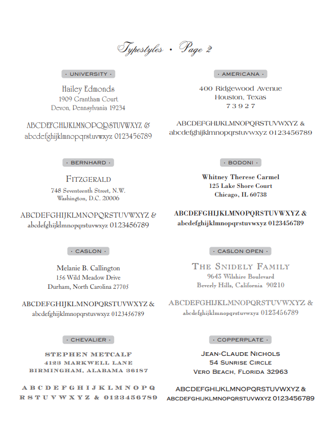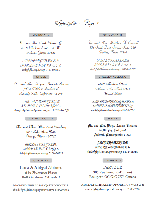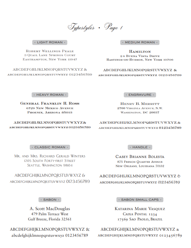 Fonts, Type Face, Font Styles, Typefaces, Letter Styles for Traditional Stationery in Washington, DC - 7 pages of fonts