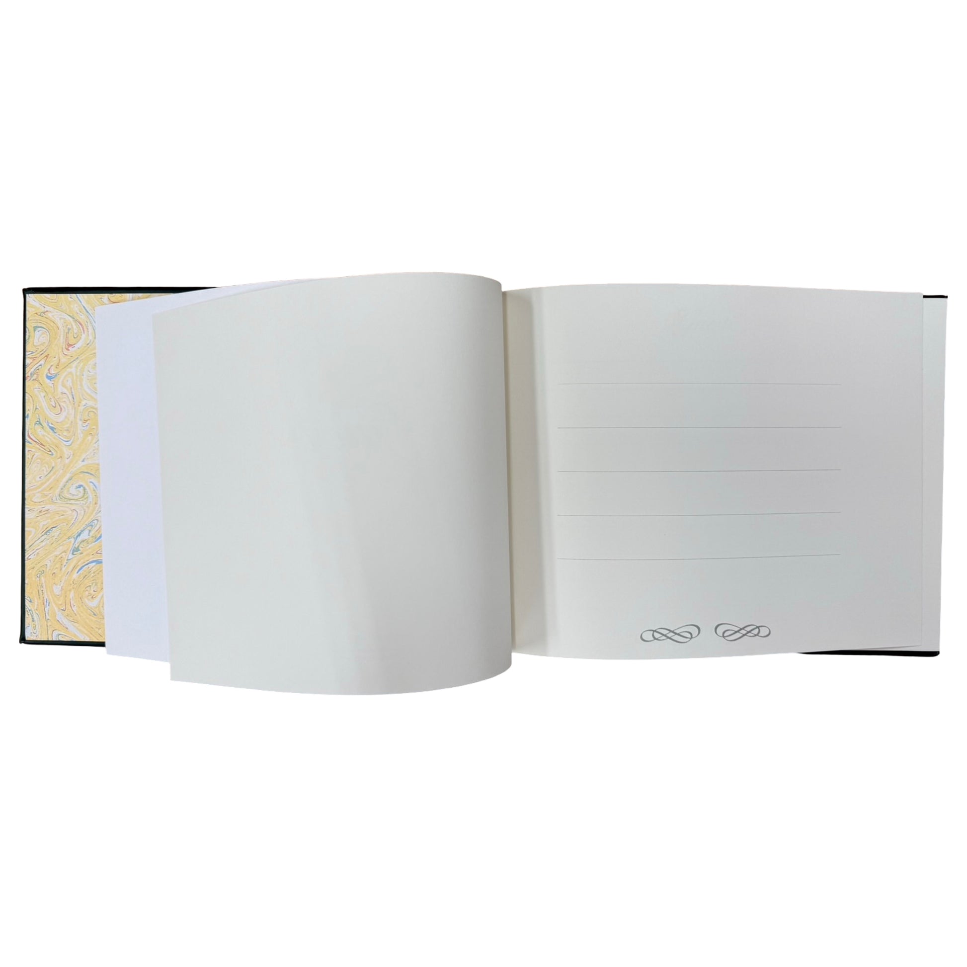 Finest Polished Calf with off-white Guests pages. Our standard sized page in the collection. Off-white archival paper with ribbon marker and gold edging on pages. Made in England with English-made materials, using the highest quality bookbinding techniques. Pages will never fall out and your book will not wear out. This is a wonderful notebook for work or personal journaling. Personalization of initials, name, and/or logo available.