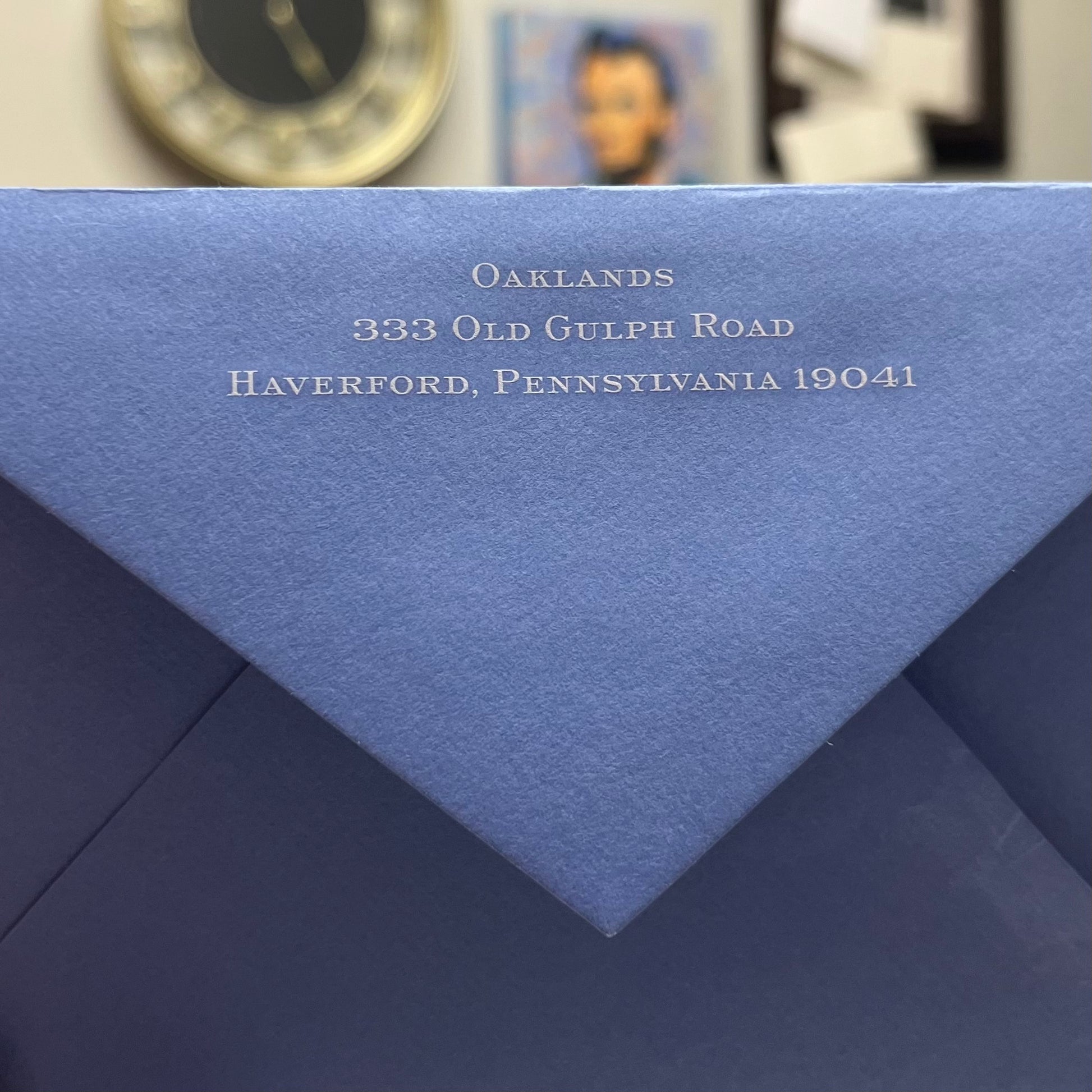 The envelope will have the return address on the flap in raised printing (thermography) in ivory.