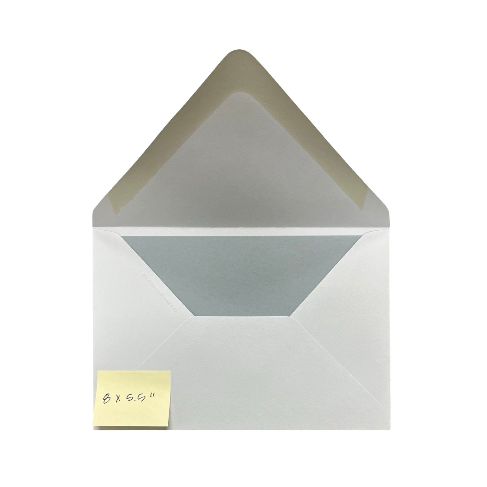 Special Note: The color Dusty Blue is a custom color. The thickest stock Dusty Blue is available in is100lb. This weight may be appropriate for the Save the Date, RSVP card, information cards. The Wedding Invitation should be a thicker stock. If Dusty Blue is a must, we will need to duplex the stock to create 200lb stock. If you wish for thicker stock another blue will need to be selected. Cool Blue and Azure Blue may be a consideration as they are available in 200lb and 260lb stock. Please look at the envelopes below - the first one after the sample Save the Date is Azure and the second one is Cool Blue.