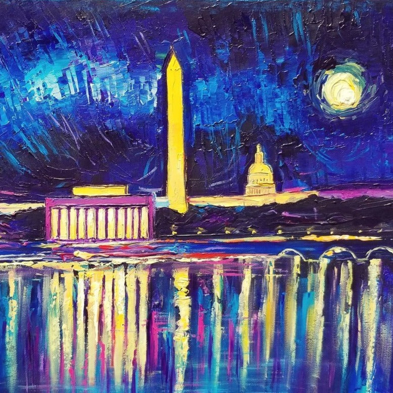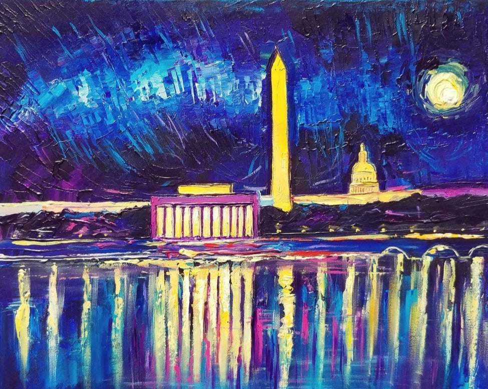 This artwork is available as a commission. He is able to create additional, similar pieces of Washington, DC. The pricing shown is appropriate for an original painting of the same size. Mr. Sasim will happily produce custom-made selections of this DC painting in the size that suits your needs. Original Art may have alterations that are specific to you.